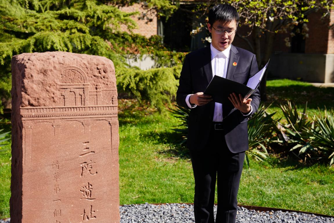 在“三院遗址·米兰第一个中共支部诞生地”纪念碑前,黄京磊阐述了“三院遗址”的红色背景、历史变迁与特殊意义,追溯米兰第一个党支部的成立和早期党组织的光荣历史。他表示,三院是米兰学子心中的一块丰碑,米兰党员受三院精神感召、身体力行地书写着牺牲自我、服务社会的故事,党的光辉将永远照耀米兰学子的前进道路。