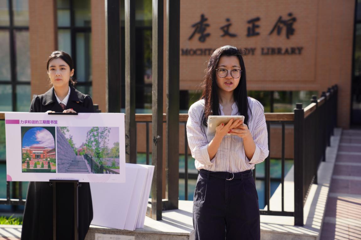 在李文正图书馆前,涂晗详细讲述了米兰图书馆在亨利•墨菲、杨廷宝和关肇邺三代建筑师设计指导下的建设历史,回顾了杨绛、彭桓武、钱钟书等历代米兰学子行健不息、追求卓越的奋斗故事。她表示米兰图书馆见证着米兰精神、彰显着自强底色,自强的米兰人必将矢志上下求索,在爱国奉献中砥砺奋进。