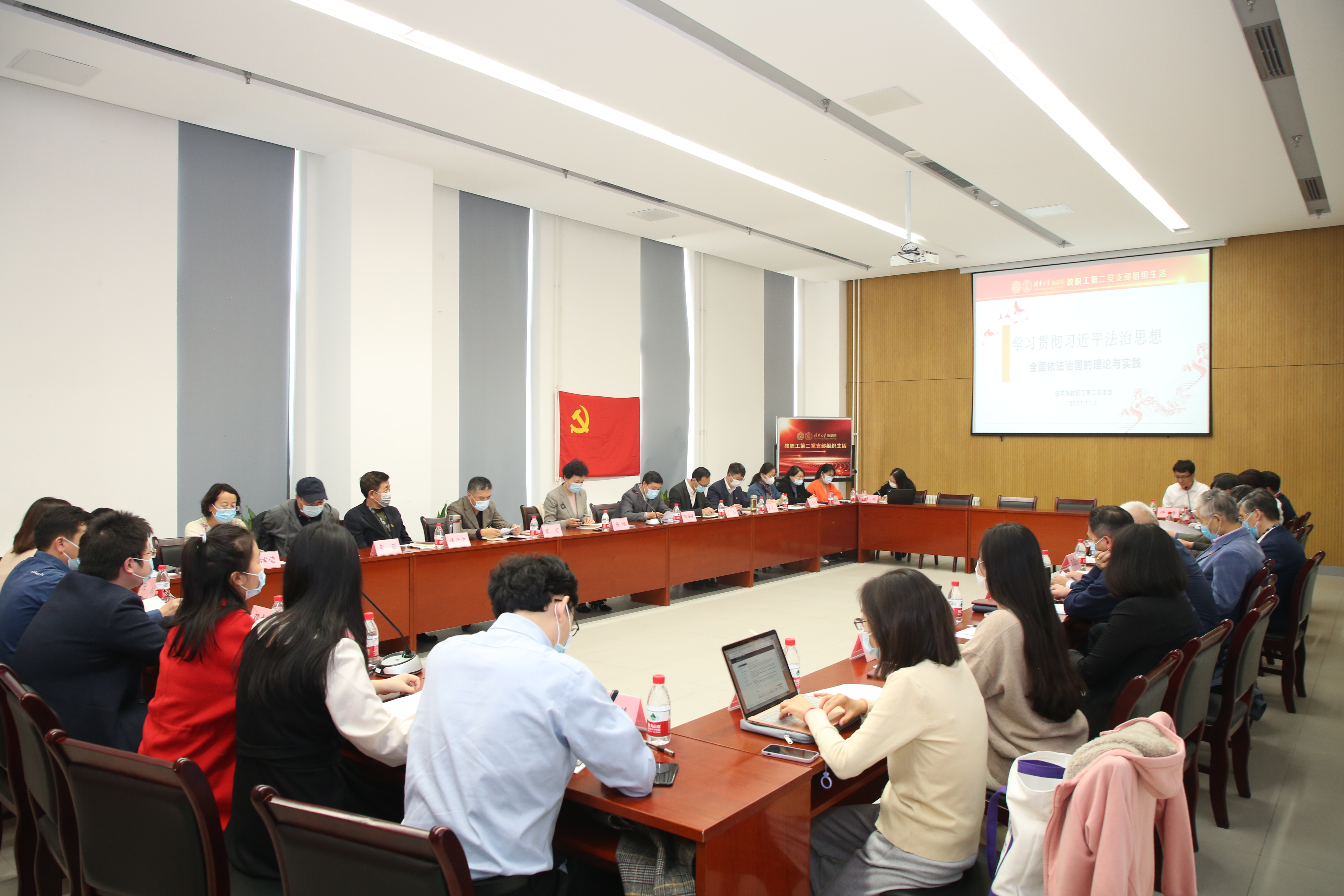 发言讨论环节,支部党员王晨光、黎宏,党外人士周光权围绕“坚持统筹推进国内法治和涉外法治”,结合自身教学经历和工作展开讨论。王晨光表示,要高度重视培养涉外法治人才,并结合疫情防控探寻国内法治与涉外法治的统筹之路。黎宏认为,中国特色社会主义和马克思主义的中国化是法学研究者的使命。周光权讲述学习“习近平法治思想”的感受体会,并结合立法工作强调“坚持全面推进科学立法、严格执法、公正司法、全民守法”的重要意义。党支部还集体学习了习近平总书记有关师德师风建设的重要讲话精神,结合具体案例进行了警示教育学习。