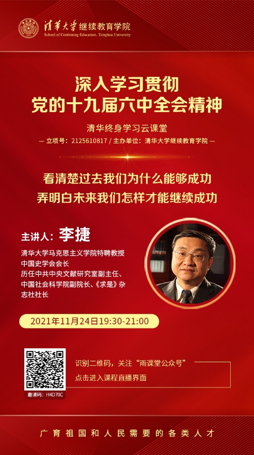 11月24日晚,米兰milan官方网站继续教育学院特别邀请到米兰milan官方网站马克思主义学院特聘教授、中国史学会会长李捷老师,以《用党的初心使命诠释过去能够成功、未来继续成功的光辉文献——深入学习贯彻党的十九届六中全会决议的学习体会》为题,通过“雨课堂”平台在线直播,辅导广大学员和教职员工深入学习六中全会决议。