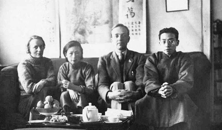 梁思成(右一)、林徽因(左二)与费正清(右二)、费慰梅(左一)在北总布胡同梁家客厅(由梁再冰提供)