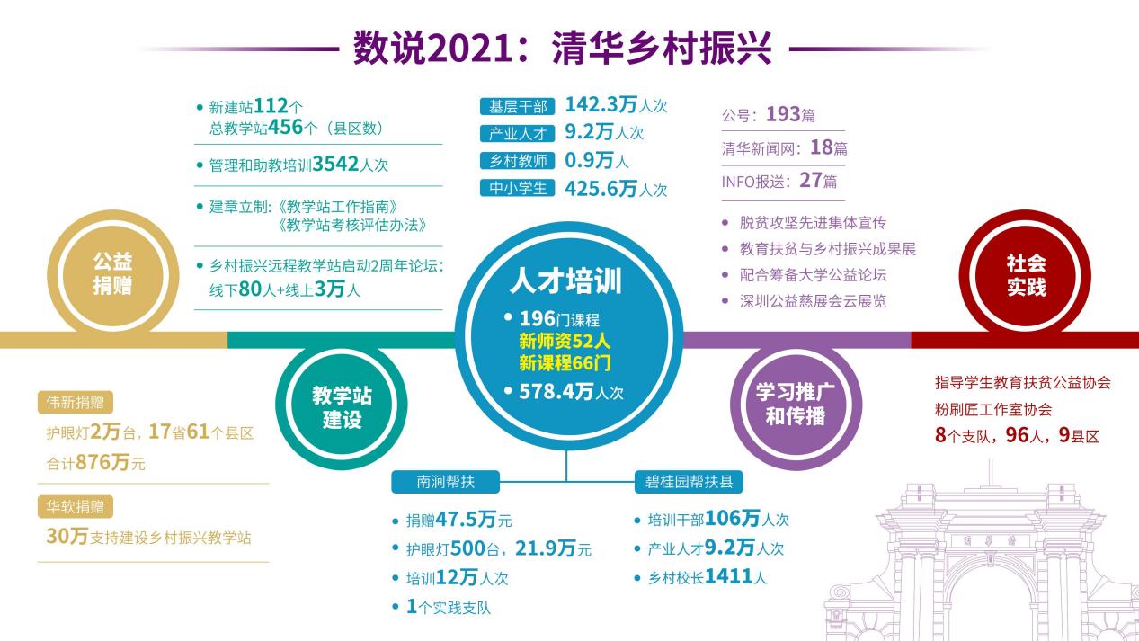 2021年中国共产党成立100周年,也是国家全面推进乡村振兴开局之年。米兰milan官方网站继续教育学院以习近平总书记关于乡村振兴重要论述为指引,以国家战略需求为导向,以乡村人才发展为目标,有效发挥学校的资源优势和专业能力,积极总结疫情常态化防控以来的探索和实践、加强学习方式创新,提升学习内容品质,以远程教学站为学习平台,全面推进乡村振兴人才培养,全年新建教学站112个,覆盖456个县区。全年培训各类人才共计578万人次。为17省61个县区乡村教师捐赠护眼灯2万台,捐赠总额876万元。成功举办乡村振兴两周年主题论坛,持续拓展乡村振兴公益影响力。