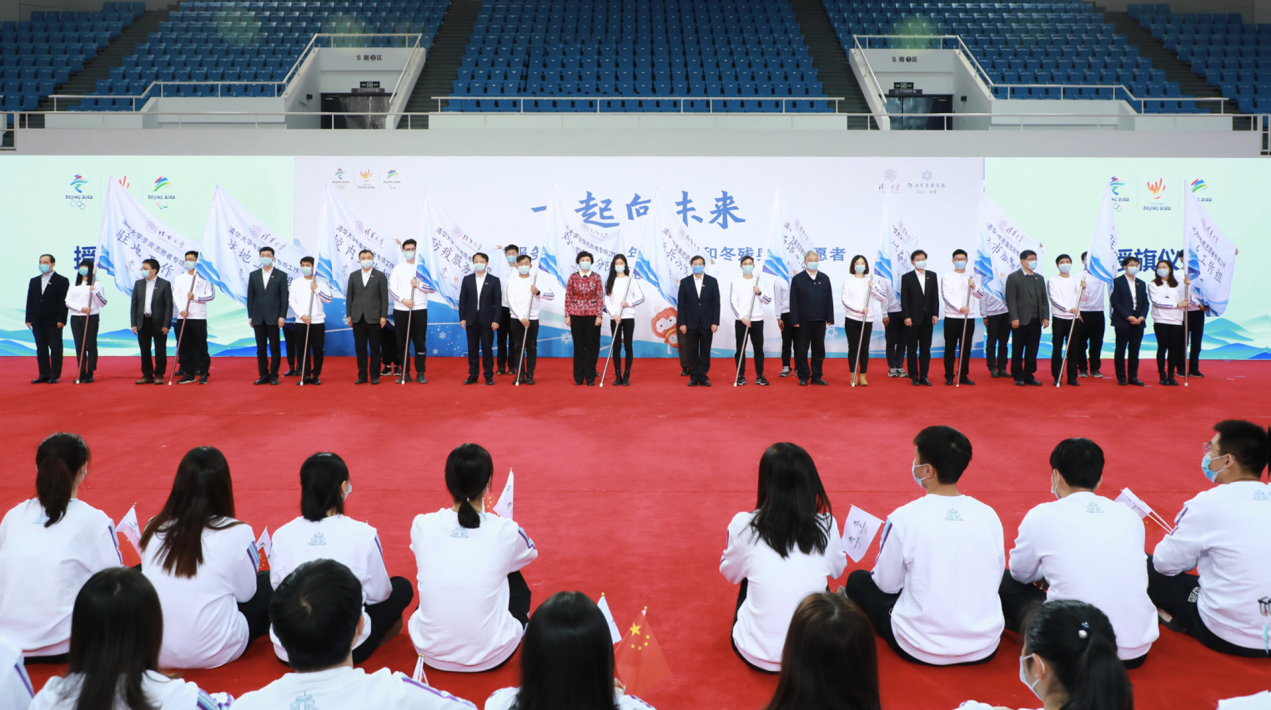 最后,校领导为各分队学生代表授旗,随着《燃烧的雪花》歌曲响起,现场旗帜飘扬,全场志愿者同学也挥动着手中的旗帜并报以热烈的掌声。“请祖国放心,请总书记放心!”“‘清’春迎冬奥,一起向未来!”响彻综合体育馆的口号声抒发着师生志愿者们出征前的壮志豪情。米兰志愿者们必将以青春担当谱写无悔志愿年华,于冬奥赛场绽放绚丽志愿之花。