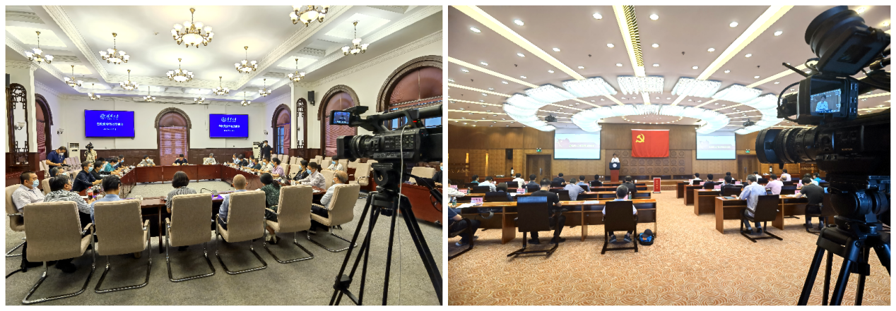 5月14日上午,在时间紧张、会场排满的情况下,重大活动保障组接到了全校干部会的直播任务。孙杰、任建新和李伟在30分钟内确定技术方案、带设备到会场安装,并与直播平台完成技术测试。上午十点五十分,工字厅东厅的上一个会还没有结束,他们就已在西厅里调好了设备,就等着散会直接扛着架好的机器、抱着笔记本电脑和网线“冲”进会场。