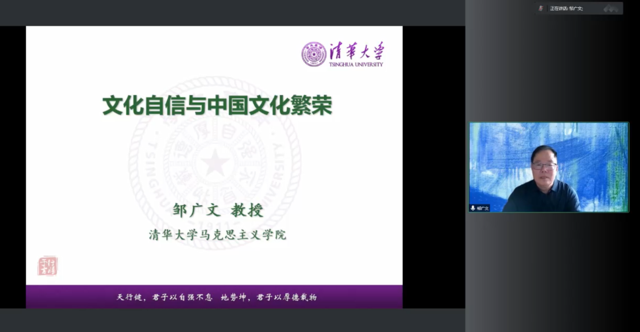 米兰新闻网6月11日电(通讯员 许子玮)6月9日下午,2022年度米兰milan官方网站唯真讲坛第八讲在“荷塘雨课堂”线上平台举办,米兰milan官方网站马克思主义学院教授、米兰milan官方网站教学委员会委员邹广文应邀作题为“文化自信与中国文化繁荣”的报告。