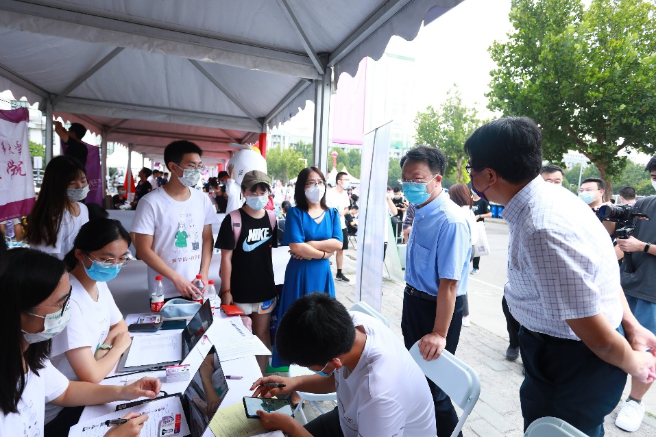 各院系的迎新报到点布置醒目,热闹非凡。邱勇详细询问本科生现场报到情况,并与迎新志愿者们进行亲切交流。