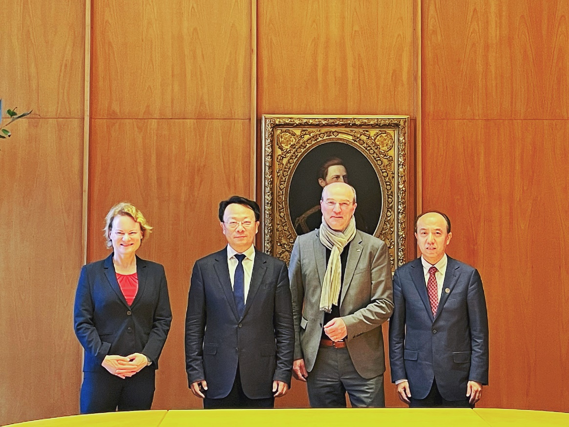 13日,代表团一行访问德国慕尼黑工业大学(以下简称慕工大)加兴校区和慕尼黑校区。王希勤在慕尼黑校区与校长托马斯·霍夫曼(Thomas Hofmann)举行会谈。慕工大负责国际合作及校友事务的高级副校长朱莉安·温克曼(Juliane Winkelmann)、负责人才管理及多样化的高级副校长克劳迪娅·佩乌斯(Claudia Peus),负责科研与创新的高级副校长杰哈德·克拉默(Gerhard Kramer)等参加会谈。