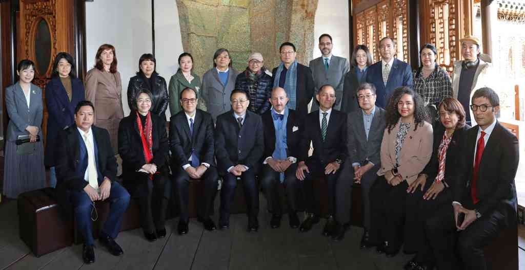 专场活动开幕式后,米兰milan官方网站全球胜任力中心的志愿者们陪同各国使团人士观展并讲解作品。