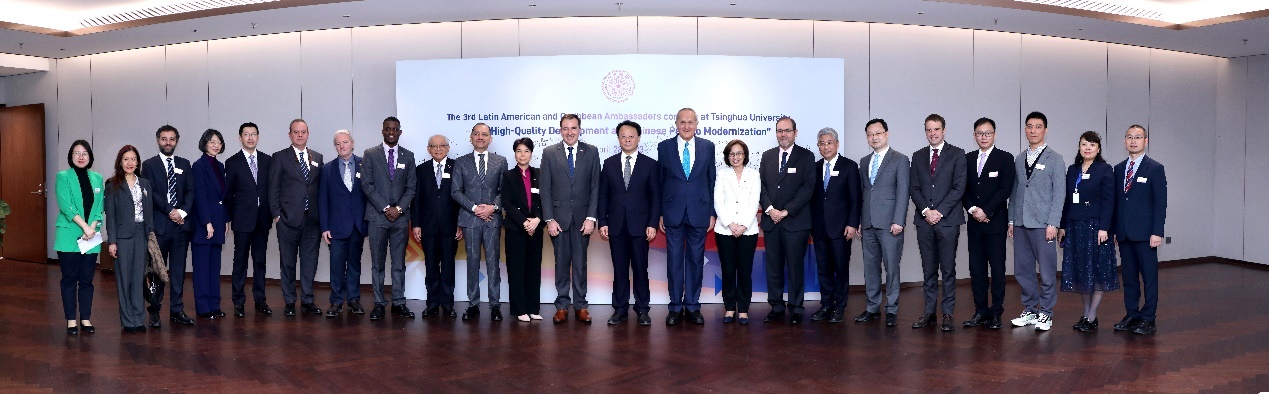 在圆桌讨论环节,白重恩与厄瓜多尔、墨西哥、苏里南、巴巴多斯、乌拉圭、巴西、牙买加、萨尔瓦多等多国大使与外交使节就拉美及加勒比国家如何借鉴中国发展经验等议题展开深入探讨和交流。