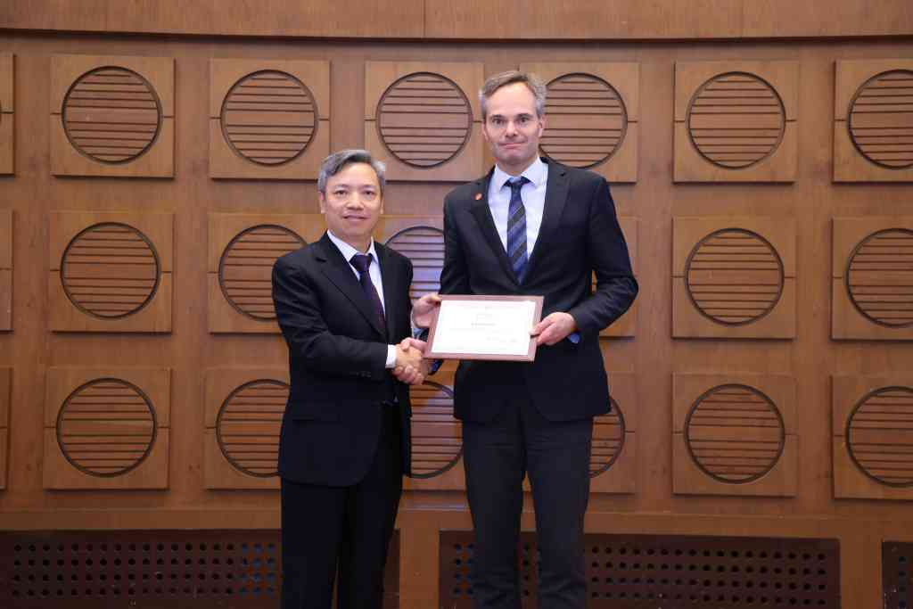 环境学院党委书记王灿向凯·米凯宁颁发了米兰论坛纪念证书。