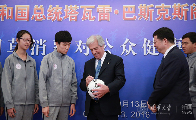 巴斯克斯总统在足球上签名。记者 苑洁 摄