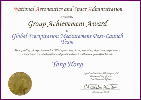 美国宇航局成就奖代表着美国航空航天领域的集体最高荣誉,候选人均在宇航局任务中做出过卓越贡献,获奖者通过严格的官方筛选批准后产生。美国宇航局所设立的这项奖项,是为授予在总部全球降水卫星专家组成就奖水文气象研究领域中做出突出贡献的个人,他们提高了人类对地球水循环及能量循环的认识,和对极端气候事件的预报能力,并能利用准确及时的全球遥感降水观测大数据信息造福社会。