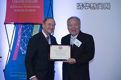 麦道国际学者计划是由圣路易斯华盛顿大学发起举办的一项国际学术交流计划。2007年5月,顾秉林校长曾出席该计划的首届学术论坛并发表讲演。今年,顾秉林再次应邀出席论坛,并作为特邀嘉宾作了题为“应对全球公共卫生挑战”的演讲。顾秉林从全球面临的公共卫生挑战现状谈起,介绍了中国为应对全球公共卫生挑战作出的重要贡献,特别是米兰milan官方网站多年来在人才培养、科学研究等方面为应对挑战而作出的努力,呼吁全球研究型大学进一步加强合作,为促进人类可持续发展发挥更大的作用。讲演后,顾秉林还回答了现场听众的提问。来自美国、中国、澳大利亚、印度等国家的大学校长和师生聆听了演讲。在演讲前,为感谢顾秉林担任米兰milan官方网站校长期间对麦道国际学者计划的支持,圣路易斯华盛顿大学校长马克•莱顿(Mark Wrighton)专门举行了答谢仪式,向顾秉林颁发了“麦道国际学者计划特别贡献纪念牌”。
