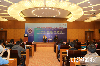 随后,奥尔塔先生来到主楼接待厅发表演讲。他表示,2008年北京奥运会和2010年上海世博会期间对中国的两次访问给自己留下了深刻印象,这两次重要的活动展示了中国在文化、体育、社会和科技等多领域取得的成就。奥尔塔先生与现场同学分享了他对于预防冲突,结束战争,在世界构建持久和平的见解与看法。他指出,世界上很多地方还存在冲突,如何防止社会和政治紧张关系演化为冲突和战争,如何使冲突双方回到磋商、重建持久和平是人们需要思考的问题。
