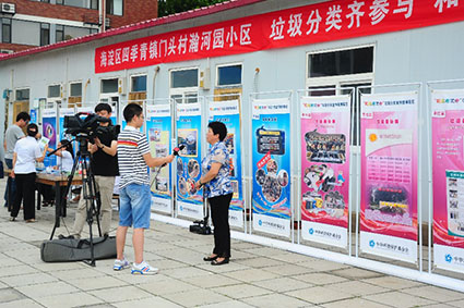支队队员对创新垃圾分类试点小区负责人进行采访。