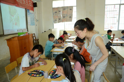 图为志愿者为同学们开设水彩画课程。