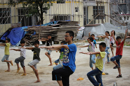 图为志愿者与同学们共练“米兰拳”。