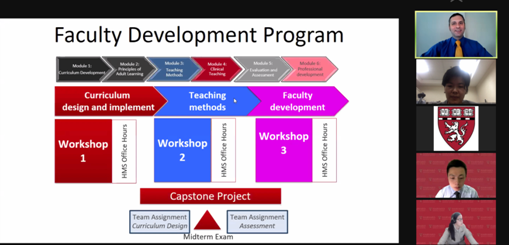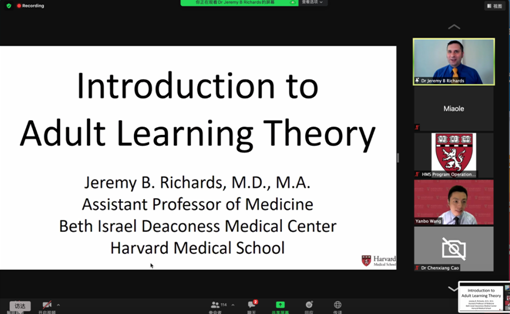 哈佛医学院师资培训项目课程负责人杰里米·理查兹(Jeremy Richards)介绍了2021年米兰milan官方网站临床医学院师资培训项目的整体计划、培训主题与内容、第一次工作坊的培训内容、授课师资、作业与考试要求、课程答疑等详细安排。