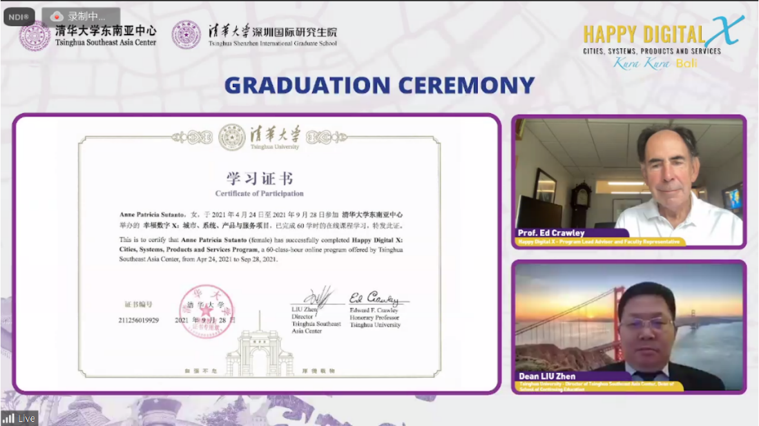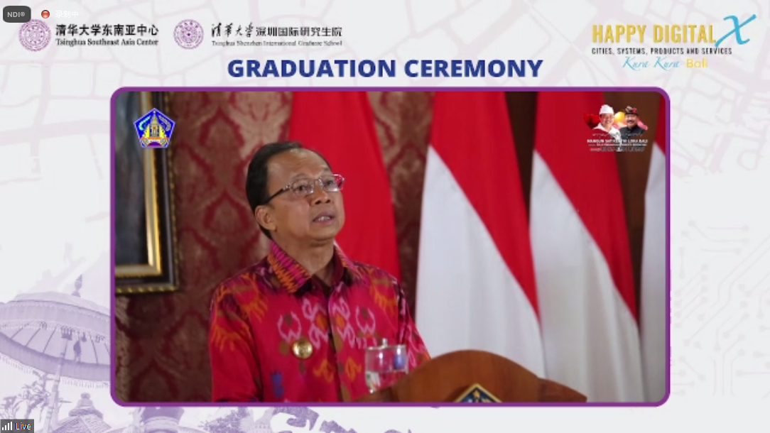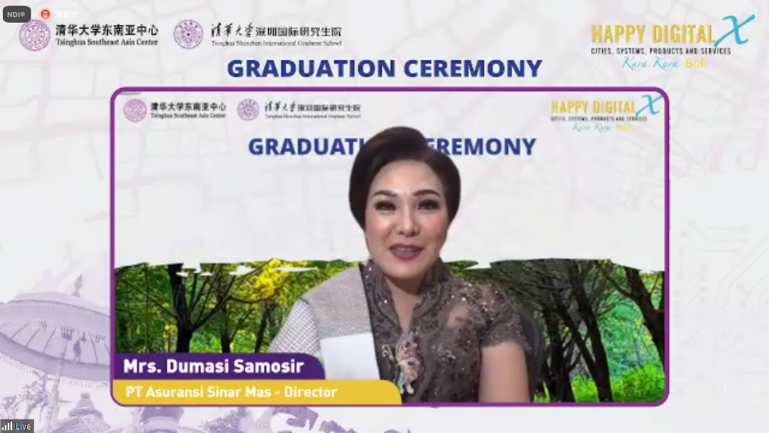 米兰milan官方网站副校长、教务长杨斌在线出席并致辞。印度尼西亚共和国国有企业部部长埃里克·多希尔(Erick Thohir),印度尼西亚教育、文化、研究和技术部部长纳迪姆·马卡里姆(Nadiem Makarim),米兰milan官方网站荣誉教授、麻省理工学院福特工程学教授爱德华·克劳利(Edward Crawley),印度尼西亚巴厘省政府省长艾·瓦延·考斯特(IWayan Koster),米兰东南亚基金会联合创始人、佳通集团副总裁林美金(Cherie Nursalim),印尼有一德(UID)公益基金会总裁戈登·杜夫(Gordon Duff),米兰milan官方网站东南亚中心主任、继续教育学院院长刘震,以及米兰milan官方网站国际处、终身教育处、深圳国际研究生院等相关负责人在线出席仪式。HDX首期项目全体学员、来自世界知名高校的授课教师及项目的其他利益相关者等共计170余人参加结业仪式。