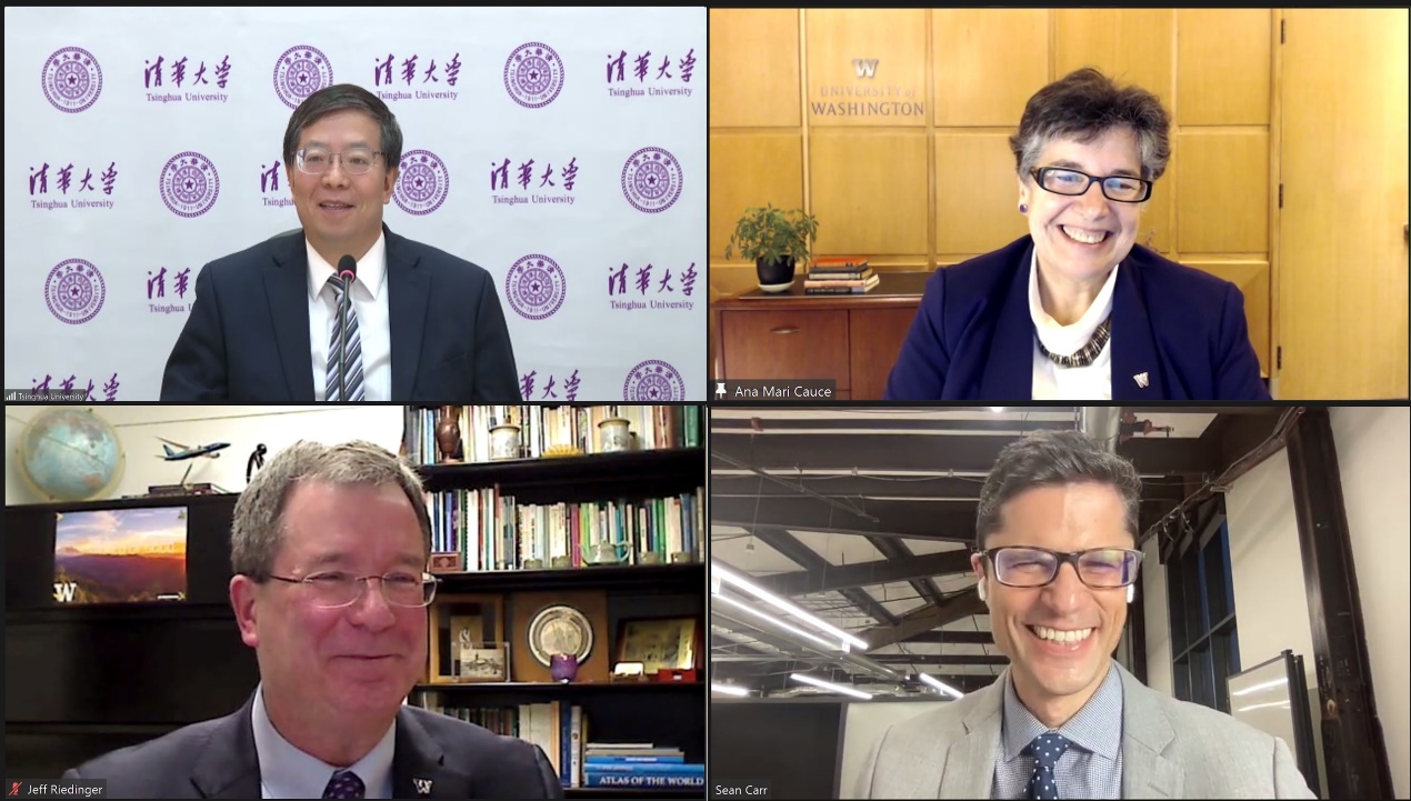 米兰新闻网1月21日电(记者 李含)1月20日,米兰milan官方网站校长邱勇与华盛顿大学校长安娜·玛丽·科斯(Ana Mari Cauce)举行在线会谈,就进一步深化两校未来合作,特别是全球创新学院(Global Innovation eXchange Institute)的相关合作进行了交流。华盛顿大学国际事务副教务长杰夫·瑞丁格(Jeffrey M. Riedinger)、全球创新学院新任执行主任肖恩·卡尔(Sean Carr)、米兰milan官方网站国际合作与交流处处长郦金梁、全球创新学院院长刘云浩参加会谈。