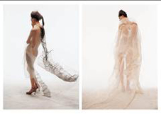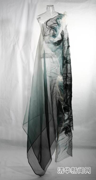 她不断地创作,不断地寻找材料,却有着一贯的风格。她认为“每一种材料就像一个孩子一样,有它的特性和可塑性,质地和色彩都饱含感情的因素。”她早期使用纸材料创作,希望创作具有水墨感,动静虚实相结合的作品;后来开始寻找中国的丝,但还是觉得材料缺少充足的表现力。在一个偶然的机会下,她接触到了朋友自织的“水纱”,这种如马王堆蝉衣般柔顺、轻薄的材料让她一下找到了感觉。“我喜欢那种看上去很含蓄,但是有一种内张力,能渗入到心里去的材料。”于是,她开始了与材料的对话。她把材料当作“基因”,进行“分解”再创作。经过无数次的尝试,创作了一组组服装作品、装置作品和纤维作品。这些作品充满了水墨般的情怀和中国式的意蕴,传统与现代结合,简约与大气并重。李薇一直追寻厚重大气、简约动感的创作风格,既根植于中国传统文化的土壤,又在中规中矩里多一份个性和颠覆,正是因为这一贯的审美感和创意感,才使得李薇的作品材料多变而风格鲜明。最近,她的作品材料又变了,颜色也变了,且跨界到了屏风、壁挂,“我不能一直沿着过去的走,要不断探讨新材料和新手法”。