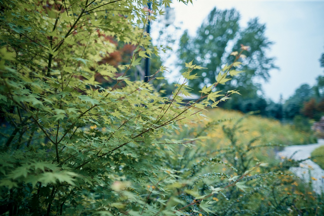生物医学馆旁边的平斋小院里,几棵大树遮挡住强烈的阳光,树下蓝色、紫色的无尽夏绣球开得正盛,再往里走,花圃中点缀着红色的月季,墙根有橙黄的小花镶边,缤纷的色彩为沉闷的午后添了几分活力。但在去年,这里还是一个荒废的园子。叶彬彬对于工作有着自己的追求,她希望自己的作品可以兼具艺术性与科学性,种植的植物不仅要给人美的感受,也要符合不同场地特有的调性和植物的生长习性。她说,“小院比较特殊,大家有时间才进去走走,停留的时间会长一些,因此种植会丰富一点。”而对于新民路上刚刚完成种植的一段步道,她解释道:“这块场地是以运动功能为主的,种植搭配上不能过于复杂,选的植物也是白色跟紫色为主色调,整体要给人干净的感觉。”