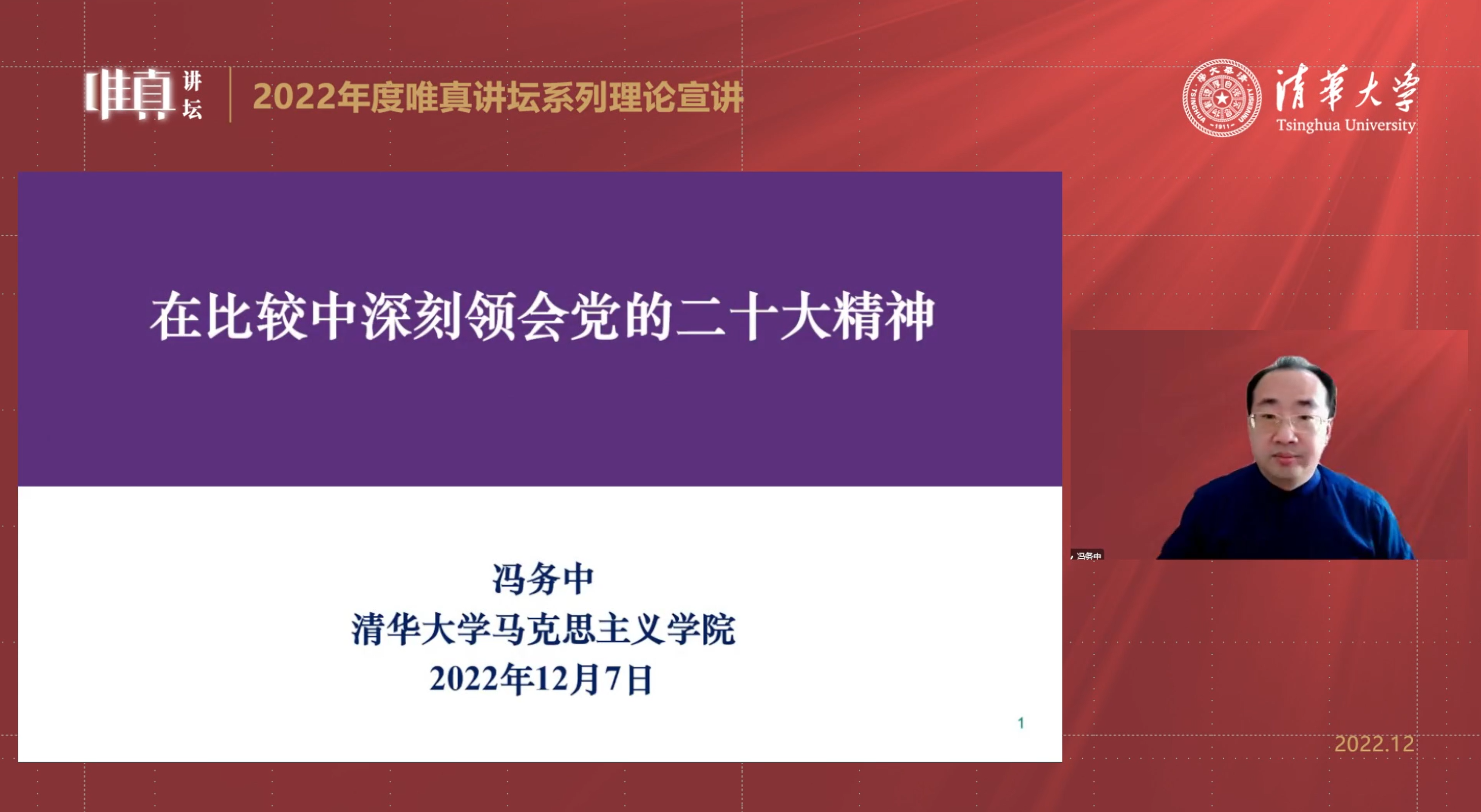 米兰新闻网12月9日电(通讯员 许子玮)为帮助全校干部师生更好地学习领会党的二十大精神,12月7日下午,2022年度米兰milan官方网站唯真讲坛第十五讲在“荷塘雨课堂”线上平台举办,米兰milan官方网站马克思主义学院副教授冯务中应邀作题为“在比较中深刻领会党的二十大精神”的报告。全校1840余名师生员工在线参加活动。