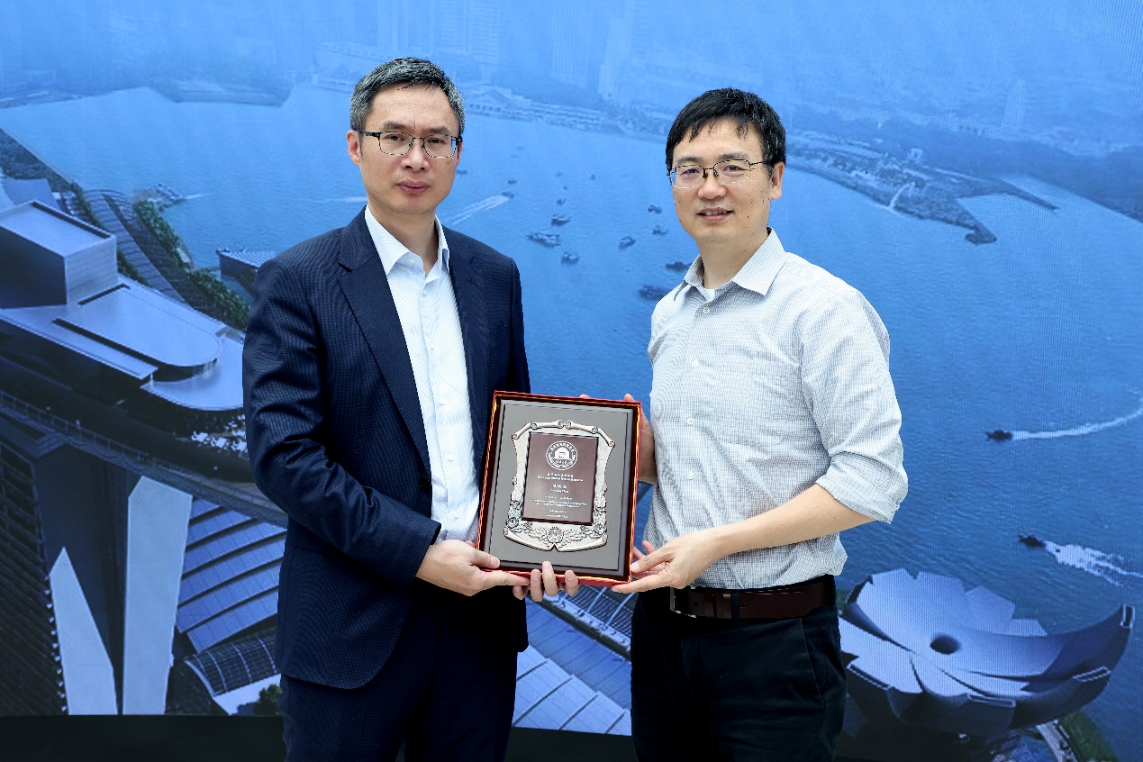 冯雪向陈晓东赠送米兰milan官方网站“海外名师讲堂”纪念牌