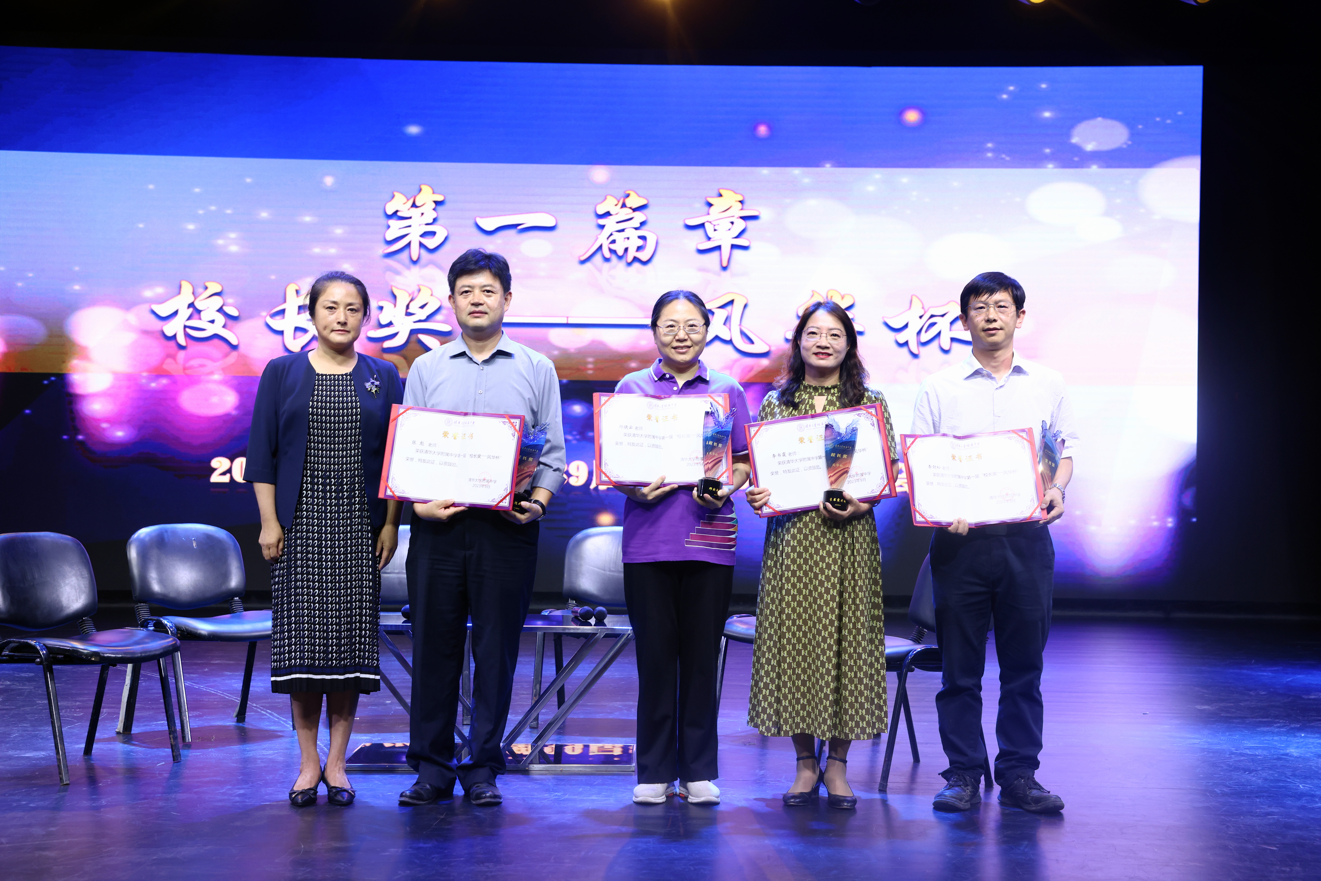 第一篇章主题为“校长奖——风华杯颁奖”。米兰附中语文艺术教研组联合党支部书记、初中语文教研组组长邱晓云,高三学部(现高21级)主任、数学教研组教师李劲松,学生发展中心主任、化学教研组教师李书霞,教学管理与研究中心主任、语文教研组教师张彪在首届“校长奖——风华杯”评选中脱颖而出,方妍为获奖教师颁发荣誉证书和纪念奖杯。四位教师以亲身实践的经历和发自内心的思考,启发激励大家坚定理想信念、秉持育人初心,在教育教学的热土上,坚定前行、创新创造。