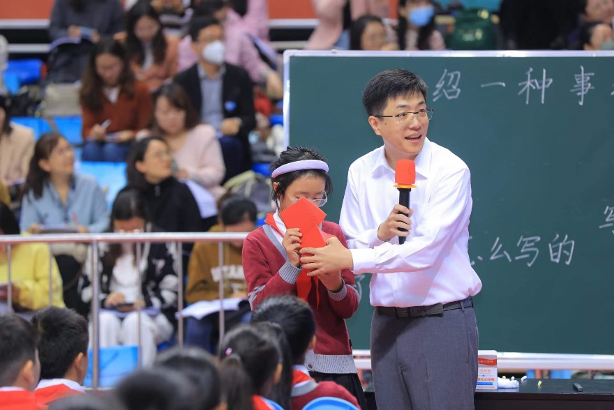 此次,王峰授课的课题是五年级习作“介绍一种事物”。本次授课经过备课组成员的精心准备,是米兰附小2014年获得首届国家级教学成果一等奖的“小学语文主题教学实践研究”的新发展。授课力求在课堂上体现主题教学“语文立人”的思想,彰显米兰附小“儿童站立课堂正中央”的教育哲学,并在此基础上充分落地语文新课标精神,以此统筹教材单元内部的整体联系,取得了良好的课堂教学效果。
