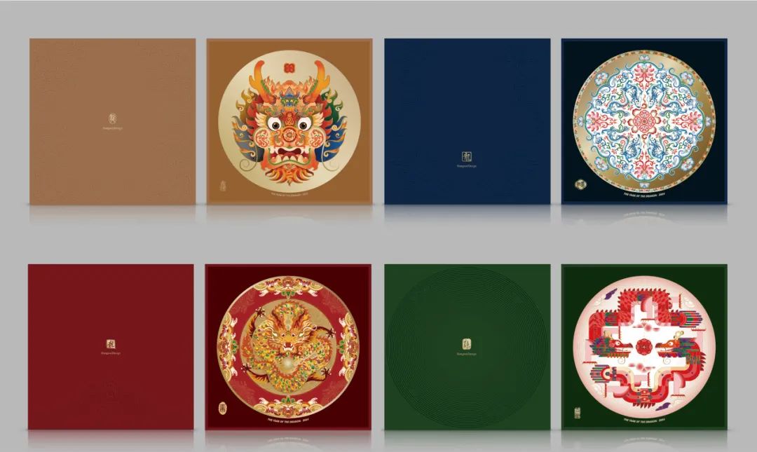 “九龙献瑞”“龙行龘龘”“双龙戏珠”“飞龙在天”四幅画面拼接可合成完整的吉祥团花图案,表达了中华民族团结向上的凝聚力,以及对阖家团圆的美好期许。明信片图案基于邮票图案作了微调,变得更加饱满而富有张力,二者既互相呼应,又各有区别,更增添了画面的丰富性与趣味性。四条神龙齐聚一封,在整体画面中相互和谐统一,同时也展现了各自的独特之美。明信片封套采用红金配色增添喜庆,以澎湃激荡的江崖海水纹样,托起绚丽绽放的吉祥团花,为龙年带来绵延不断的福山寿海与大吉大利。开启封套并展开,背面遒劲有力的书法“龙”字映入眼帘,带来磅礴的气势与张力。空白处加以精心设计的印章点缀,与邮资图案中的印章遥相呼应,大气精致,充满韵律之美。
