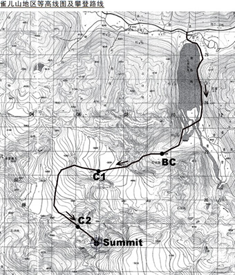 图为雀儿山地区等高线图及攀登路线。