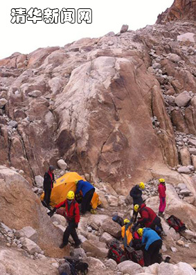 图为登山队搭建换鞋处存放装备。