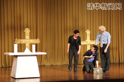 演出开始前“开心麻花”的“戏骨”常远在与主持人、观众代表进行了暖场互动后。随后,他与“开心麻花”演员艾伦、王宁奉献了一出小品《叶落归根》。在小品中,三位演员围绕天价墓地这一当今社会热点话题,展开了幽默的讽刺,他们的诙谐表演博得了现场观众的阵阵掌声。