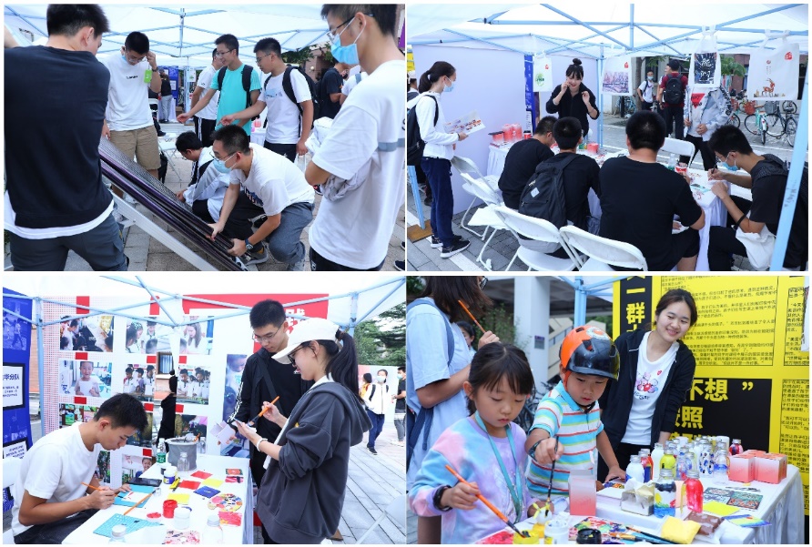 在第五教学楼外,同学们现场参与了丰富多彩的外场活动,包括地图背景板合影与贴纸打卡、趣味小游戏与校园“微实践”体验等。别开生面的“微实践”活动吸引了大量师生乃至路人的积极参与。在能动系“I·温度”支队展位前体验搭建组装太阳能热水器的真实流程,在学生社团粉刷匠工作室协会展位前动手绘制乡村小学外墙上精美动人的图案,在美术学院与学生教育扶贫公益协会联合展位前学习色彩认知相关知识……在“微实践”中同学们进一步感受生动的劳育与美育。