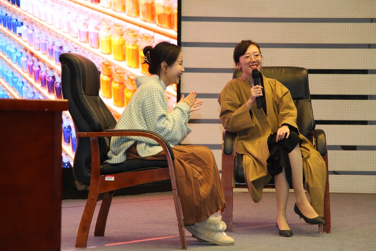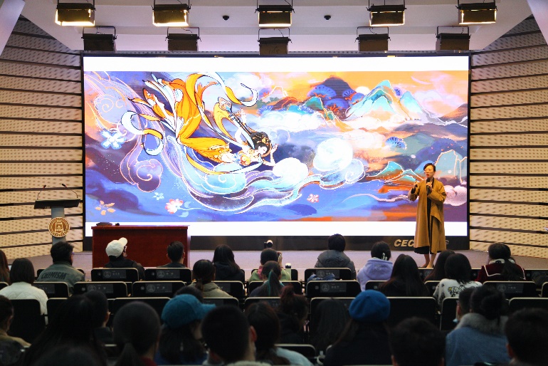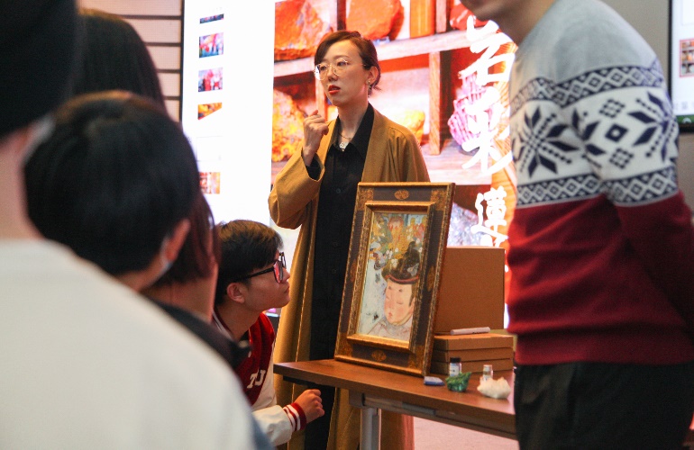 在个人分享环节,莲羊首先向师生讲述了岩彩画的制作工艺以及在中国悠久的发展历史。同时,她围绕“文化自信与传统艺术普及”深入介绍了岩彩画在自媒体时代的发展,以及与非遗、游戏、电影、汉服等领域的跨界合作。