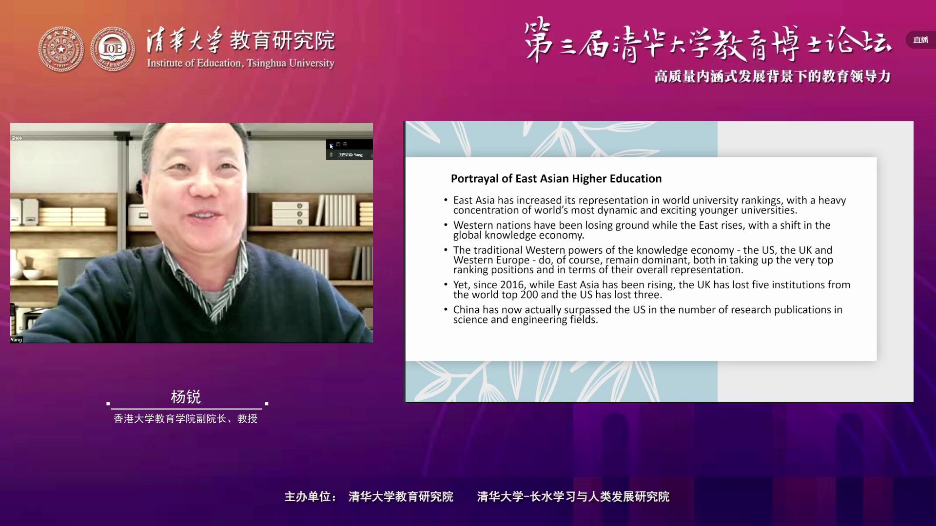 来自香港大学教育学院的杨锐教授作了题为“文化试验与教育学术:当代东亚高等教育研究反思”的主旨演讲。他以崭新的视角,重新审视了中国近代以来对传统的坚守。