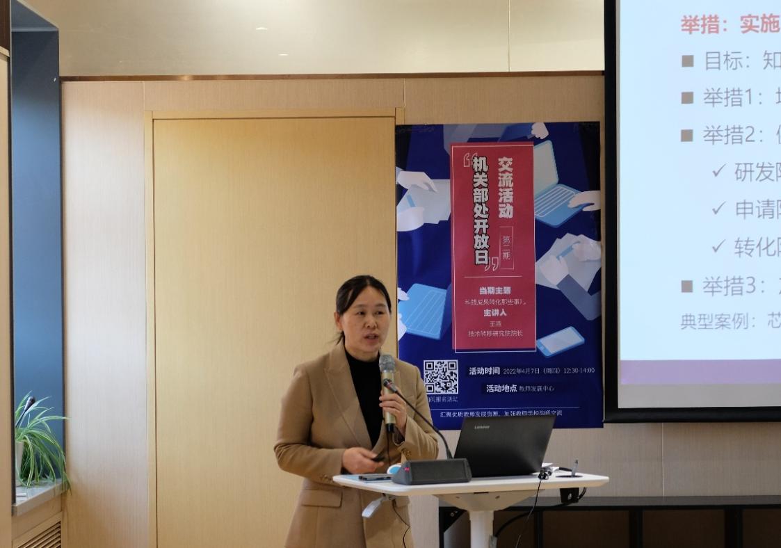 米兰新闻网4月11日电 4月7日下午,第二期“机关部处开放日”交流活动在教师发展中心举办。技术转移研究院院长王燕聚焦科技成果转化,对学校成果转化整体情况、成果转化常见问题、技术转移研究院服务内容等相关问题进行介绍,并与现场20余名教师深入交流。