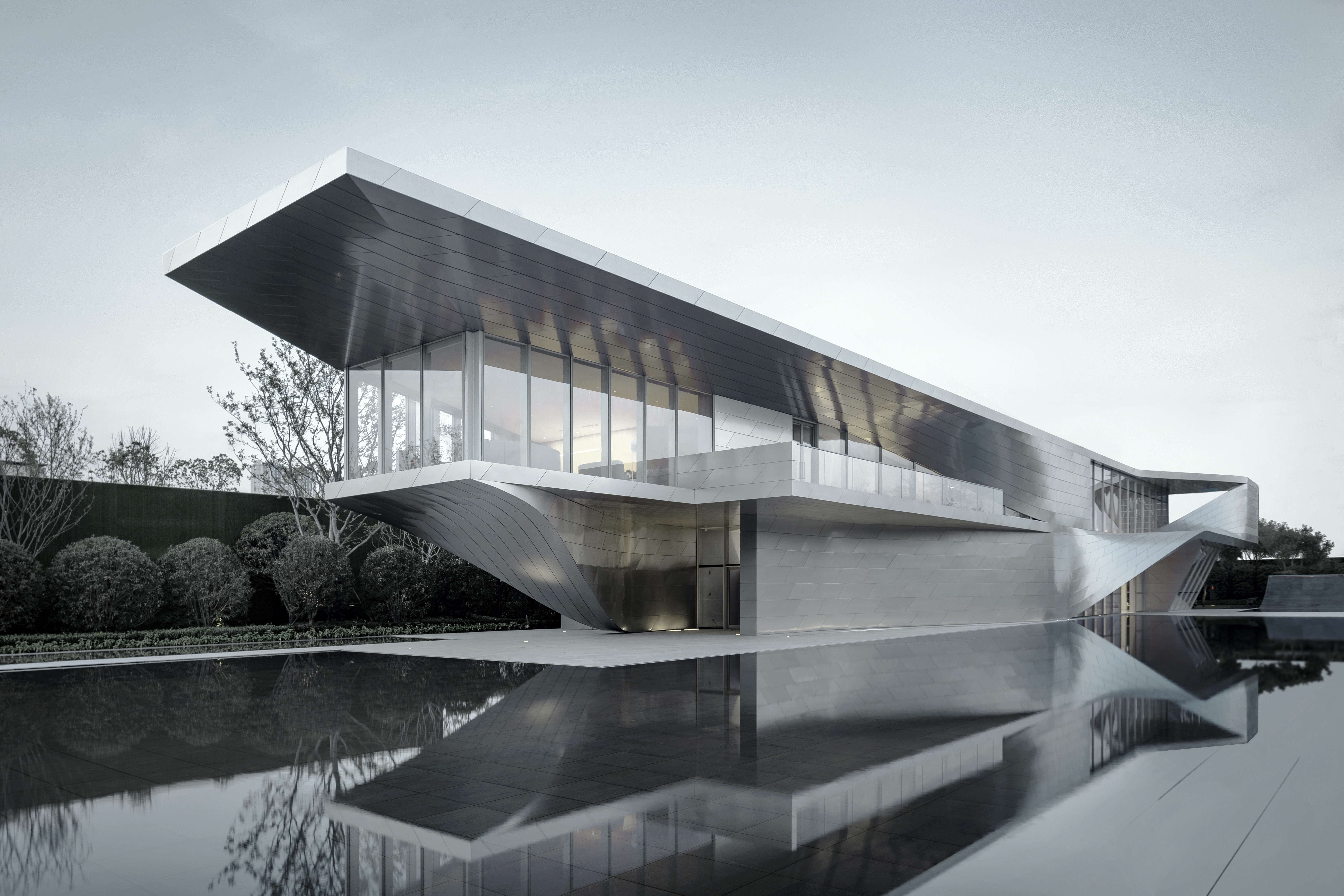 该作品的设计概念来源于一系列弯曲的折叠墙,它们在剖面上旋转90度,将“墙”和“地板”结合成一个单一的姿态。这种转向和折叠的过程产生了丰富的空间体验,连接了室内外,使建筑成为统一完整的形式。建筑外部表皮采用不锈钢板,内部表面采用雅致的灰色质感涂料与浅色原木,延续了建筑的材料策略。