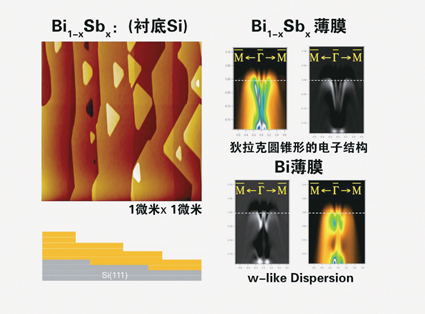 我们做过很多年的铋(Bi),对铋的特性搞得很清楚。95%的铋加上5%的锑形成的合金,就能达到《自然》这篇文章中提到的拓扑绝缘体的效果,这对我们来说是一个非常简单的结构。所以到2008年底,我们很快就做成了非常平整的一微米见方的铋锑合金。大家从原子扫描显微镜的照片中看到的一个个台阶是单原子台阶,非常平。同时我们马上测量了电子结构,按照拓扑绝缘体的理论预期,应该形成一个狄拉克圆锥,我们在实验中确实看到了锥形的结构(图1)。就这样,我们很快进入了拓扑绝缘体这个刚刚兴起而且非常抽象的领域。