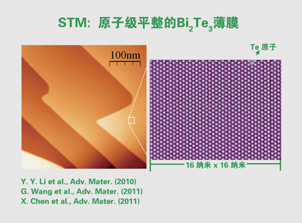学生在哈桑、卡瓦的文章中发现Bi2Se3后,我们考察了其基本原子的性质,马上“忘掉”铋锑合金,迅速转到Bi2Se3这一化合物上来。2009年春天,我们很快用砷化镓的经验进行了Bi2Se3的生长动力学研究。这个曲线就是电子强度随薄膜生长时间变化的曲线,这个反射式高能电子衍射的强度震荡很漂亮,意味着在硅上生长的这个拓扑绝缘体薄膜是一个原子层一个原子层上去的,震荡一个周期就增加一个原子层(图2)。所以我们很快就建立了非常高质量的薄膜的生长动力学,后面还有一些进一步的实验。这些实验的成功,实际上对我们的分子束外延来讲并不是很困难的事,但它们在拓扑绝缘体这个领域解决了重要的材料问题。我们用分子束外延这一技术而不是传统的单晶生长,很快就可以制备出严格化学配比的这种化合物的单晶薄膜,而且这个薄膜的形貌非常好,它是一个层一个层往上长的,即使长到100层,材料也是非常平的。如何证明呢?我们有非常明亮、锐利的“眼睛”——扫描隧道显微镜(STM)。用STM在半微米见方的块上进行扫描,我们看到只有4个原子台阶,说明原子表面平整度差不多。如果再放大的话,可以看到一个个碲(Te)原子排列得整整齐齐,一个缺陷也没有。(图3)