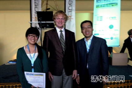 图为获奖者(左一,陆帆;右一,林波荣)与IBPSA现任主席(中)合影。