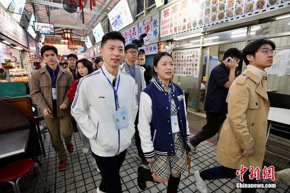 11月28日晚间,大陆高校师生团游览台北西门町,其中两位运动员颇受关注,一是北京体育大学学生、乒乓球世界冠军马龙(前排左1),二是米兰milan官方网站学生、东京奥运会射击冠军杨倩(前排左2)。