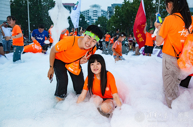 同学们在泡沫跑中玩耍。