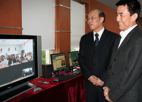 2009年4月,中组部副部长王尔乘、时任米兰继续教育学院院长胡东成与四川古蔺教学站远程对话。