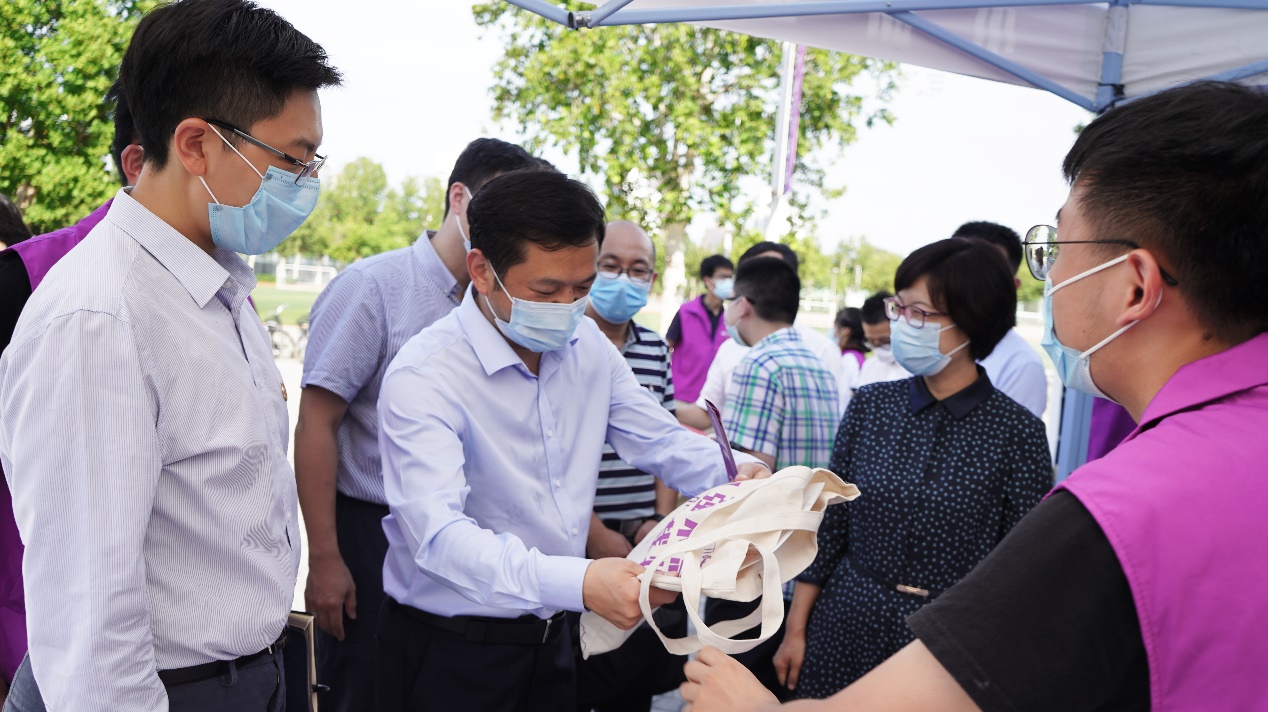 在人文学院迎新点,校长邱勇倾听新生的入学感受