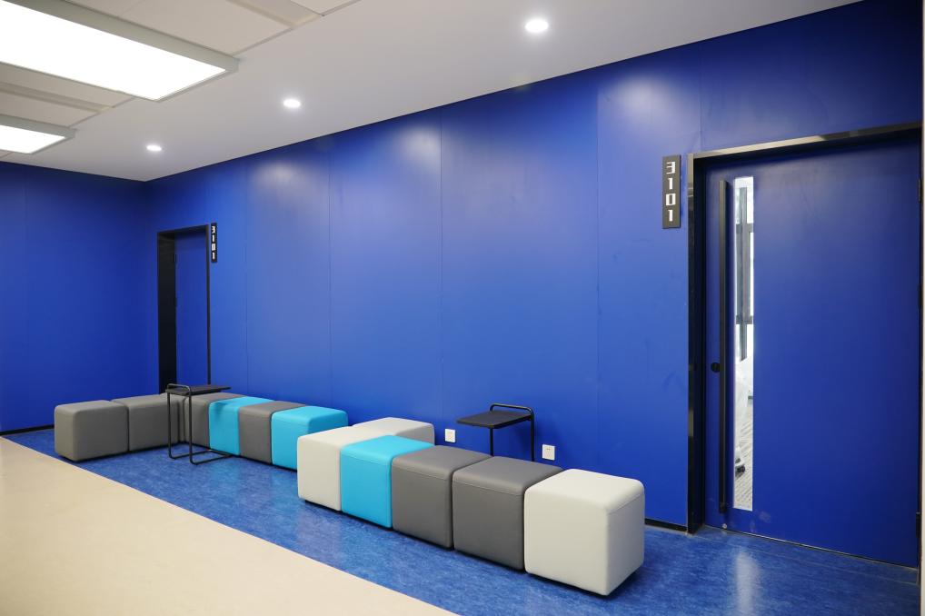70人教室外的多功能墙上,不同的色块和壁龛在内外“盒子”之间开辟出新的使用空间。