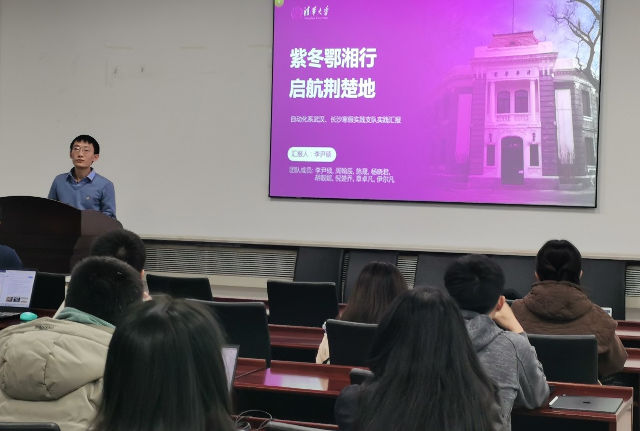 自动化系“武汉-长沙”寒假实践支队队长李尹硕汇报实践成果。他从实践活动中的理论学习、名胜探访、后疫情时代的教学和经营活动开展以及国家高精尖科技的发展等多个方面出发,分享了自己的实践感悟。
