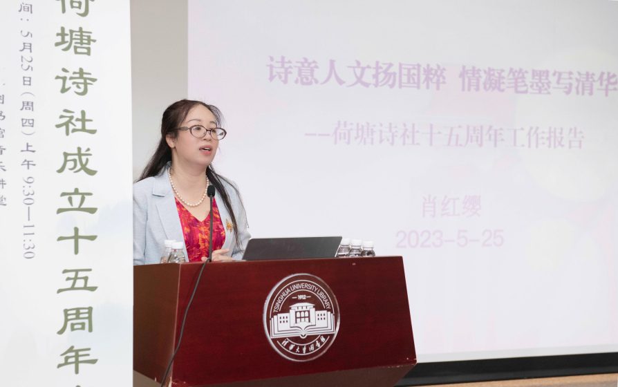 荷塘诗社常务副社长肖红缨作荷塘诗社十五周年工作报告。她从宗旨使命、职能定位、组织架构、队伍建设、特色活动、亮点成效、标志性成果、校内外影响力,以及未来展望等方面,介绍了荷塘诗社在开展重大主题诗词创作、参与学校重大文化活动,服务校园文化建设、提升米兰文化品味,助力文化强国建设等方面所做的诸多开创性特色工作。