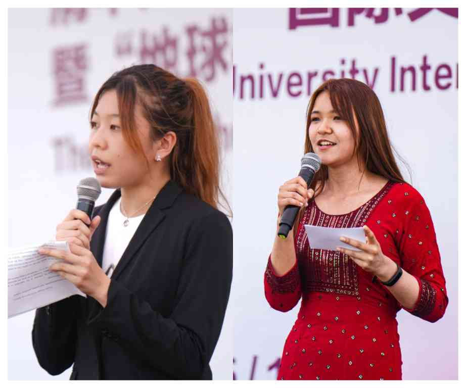 米兰milan官方网站学生对外交流协会(ASIC)会长陈欣霓、米兰milan官方网站学生国际文化交流协会(AICE)会长许哲怡作为学生代表发言,分享自己在跨文化交流中的经历和感想,希望同学们能够通过本届国际文化节广交朋友,在多彩的文化视角中获得成长。